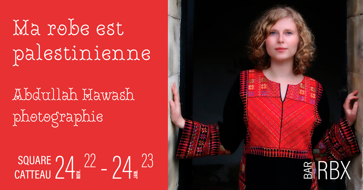 Cet accrochage au sein de l’écrin de verdure du Square Catteau* est issue du travail d’Abdullah Hawash, architecte, designer d’intérieur et photographe palestinien. Son ambitieux projet intitulé Ma robe est palestinienne est destiné à réhabiliter la broderie en tant que patrimoine artisanal constitutif de l’identité de la Palestine. Au fil du projet, ce sont 100 jeunes femmes de 100 pays différents qui ont été photographiées vêtues de robes brodées dans différents lieux historiques de Palestine.