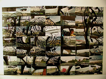 Près des gradins, est présenté Je n’ai rien appris avec l’encyclopédie. Sur chaque photographie (bâtiments modernes, images floues, routes vues par le pare brise voiture et autres), l’artiste a tracé un schéma relatif à une page de l’encyclopedia universalis. Il ne présente qu’une partie du travail réalisée en fonction des trois premiers tomes. Parfois, la page du corpus etc. est notée dans un coin de l’image, au cas où nous voudrions vérifier « la connaissance ». Est-ce que le savoir ainsi répertorié et mis en scène peut suffire à connaître le monde qui nous environne ? Ne sommes-nous qu’une somme de connaissances accumulées ?